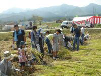 | くぎの米はおいしいぞー | エアコン・音楽あり 6条刈りコンバイン | みんなも、運転したよー | みんなで稲刈り やったぞー |