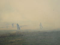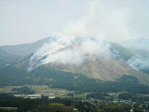 4月29日 10数年ぶりに夜峰山の野焼きが行われました。田の畦の草切りをしながらの撮影、終わる頃には南阿蘇村は煙に覆われていた。