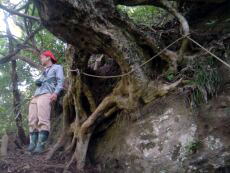 最後の水場、まさに水の生まれるところを確認、その頭の上の大樹のえだに、さるなしの花が咲きそれを仰ぎつつ階段に向かうここはBコース15分あればAコース分枝点に出る。ここから5分で自然歩道に着く。